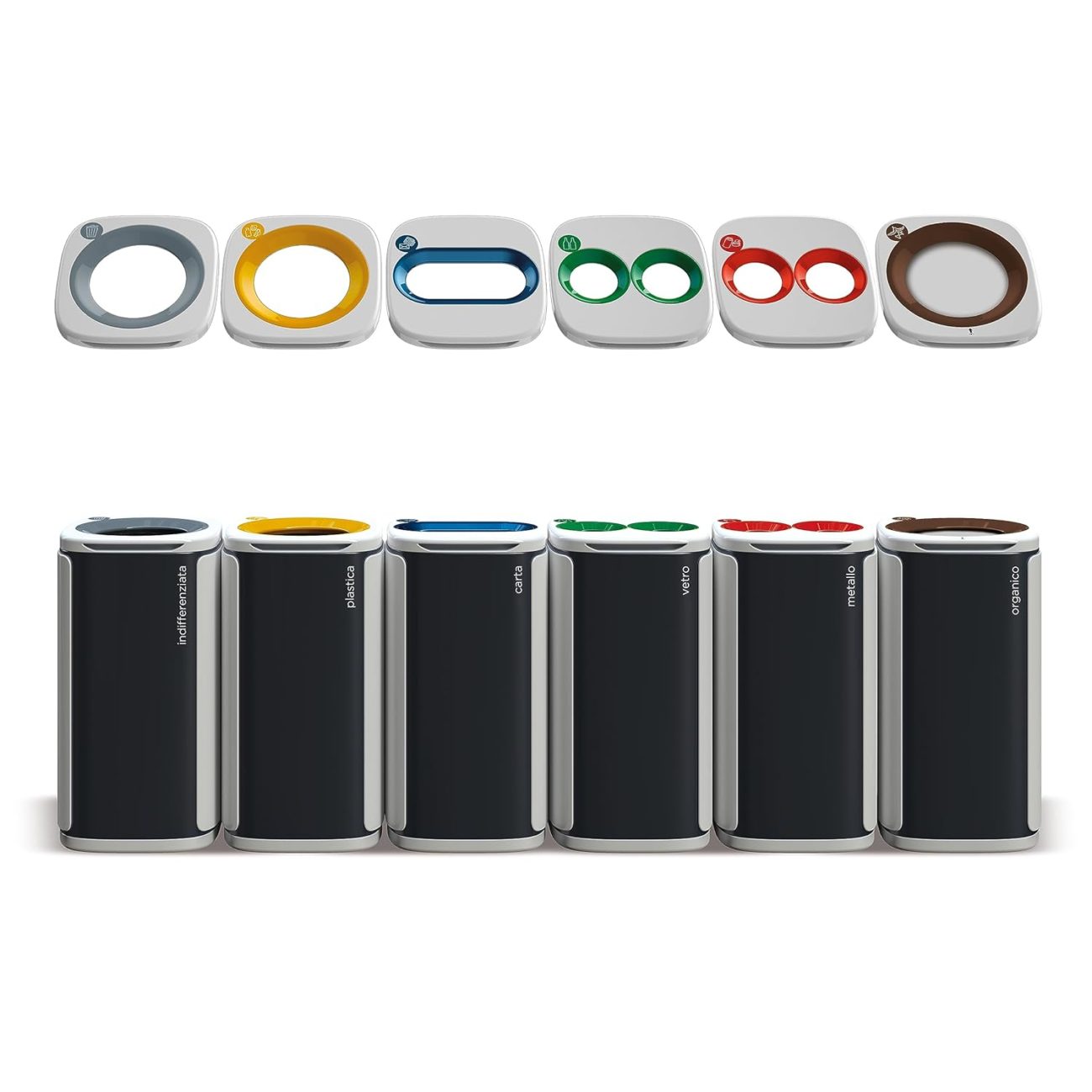 - Kosze przeznaczone do segregacji odpadów zgodnie z międzynarodowymi normami.
